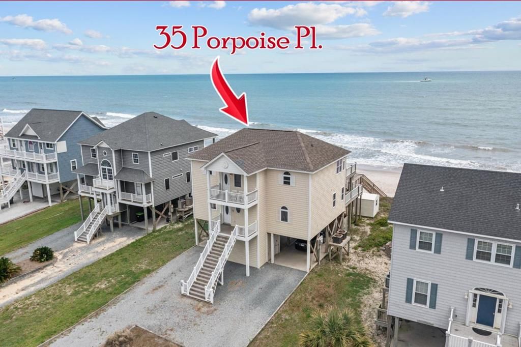 This beautiful 5 bedroom 3.5 bath home sits right on the ocean at 35 Porpoise Place in prestigious Dolphin Shores, which is located on the north end of Topsail Island. It has an elevator, hardwood floors in the living areas, carpeted bedrooms and plenty of deck space.