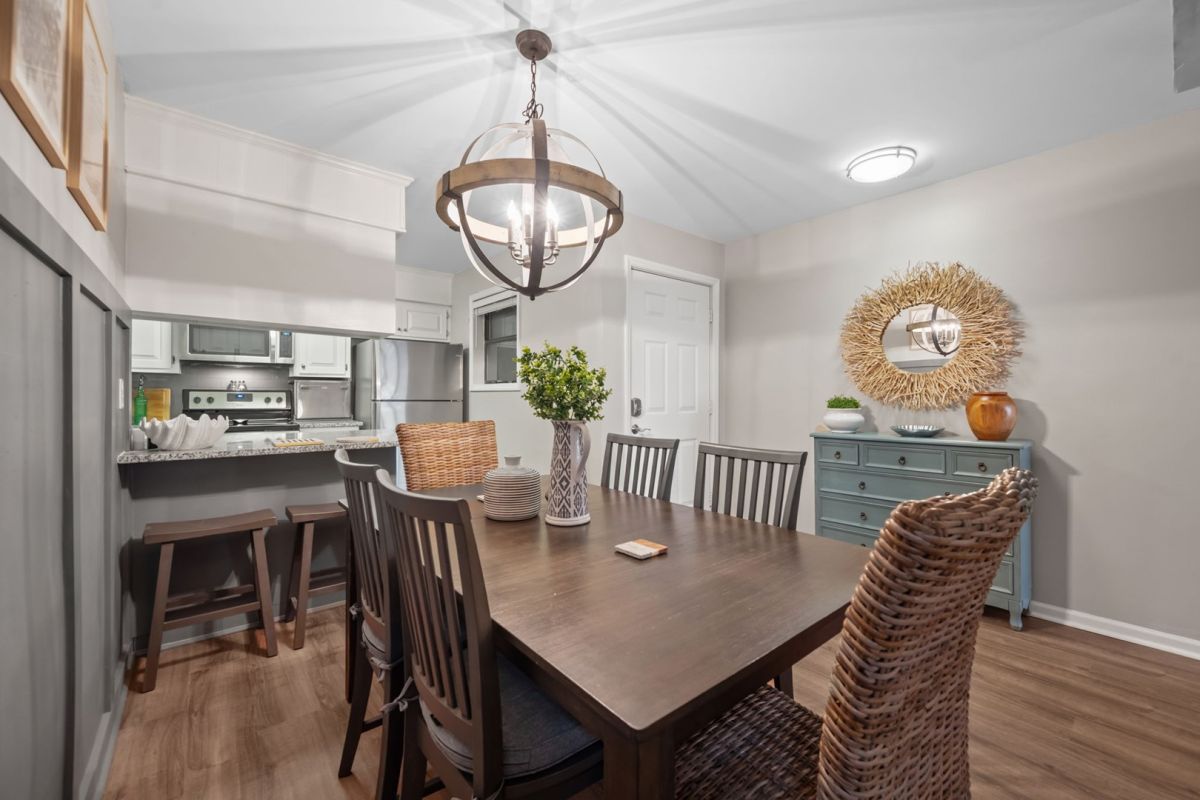 The dining area is adjacent to the kitchen and is equipped to seat 6 at the table and two others at the kitchen bar area.