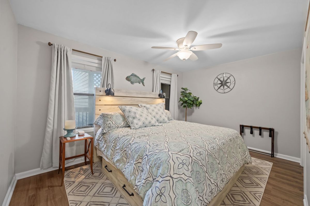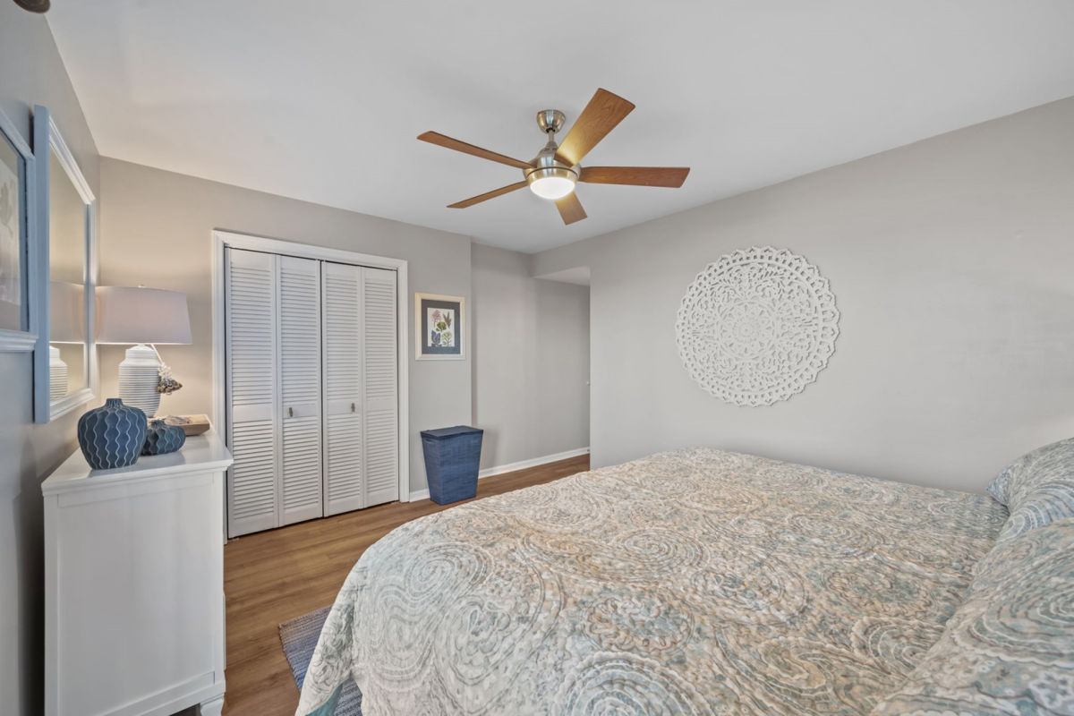 Down the hallway and well separated from the master you will find bedroom 2 which is equipped with a king bed, night stand and lamp, closet, ceiling fan and a flat screen TV.