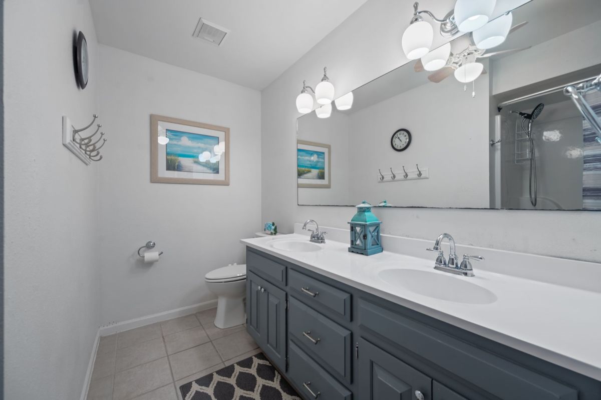 Just outside the bedroom door in the hallway, you will find a large full bath (second bathroom) with a tub and shower combination and double vanities.